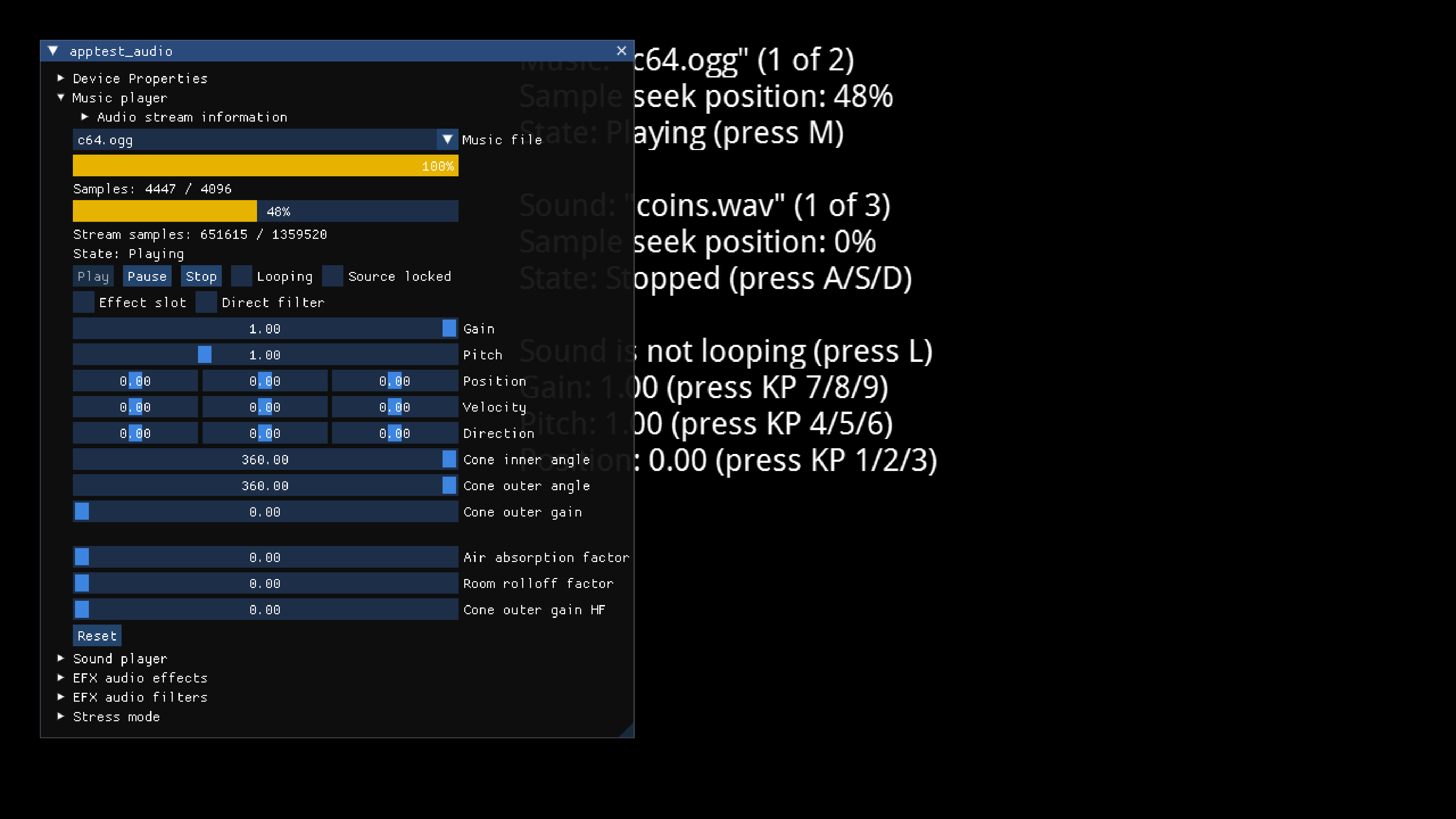 Change the pitch, gain, and horizontal position of the sound with the numeric keypad or the gamepad: