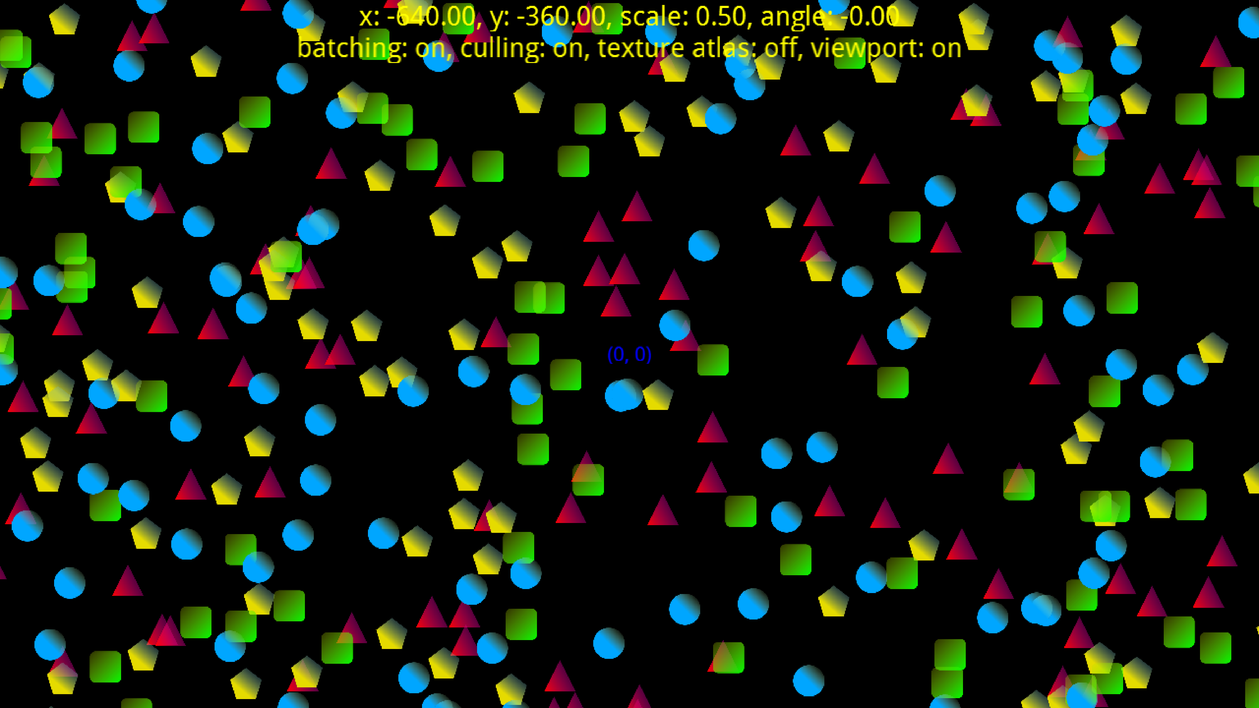 Ton the keyboard orXon the gamepad will toggle between individual textures and a texture atlas (more chances for batching) - Pressing
